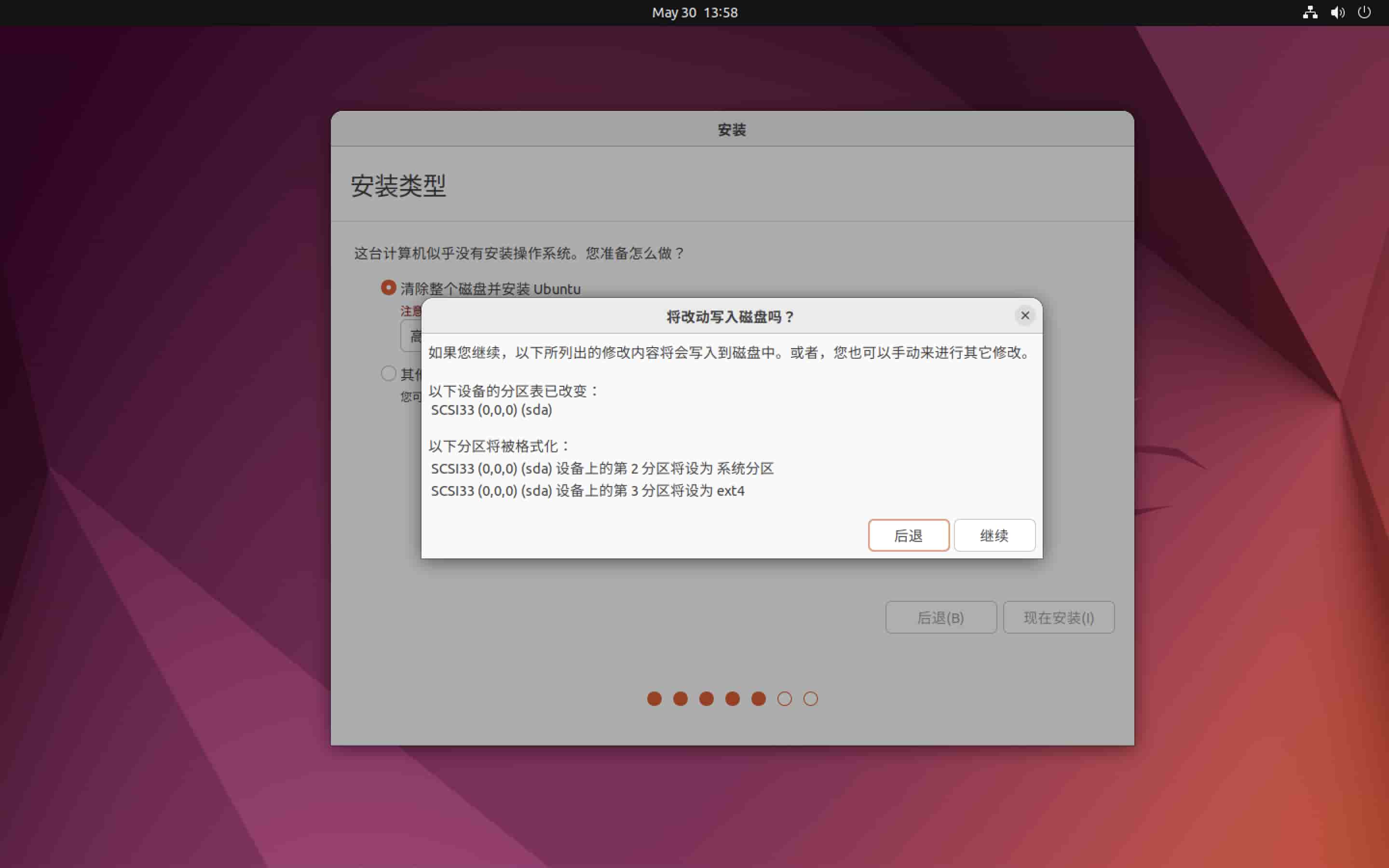 在“安装类型”界面,选择“清除整个硬盘并安装 Ubuntu”,安装程序会进行自动分区。 有经验的用户也可以选择“其他选项”自定义分区,但需要了解 Linux 的分区操作。 对于一般用户而言,建议使用默认的自动分区